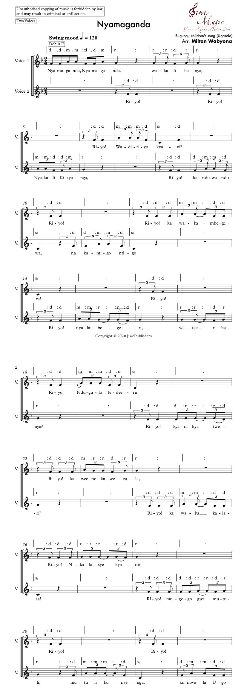 Mr Milton Wabyona transcribed and arranged this song in 2020 for Jiwe Publisher